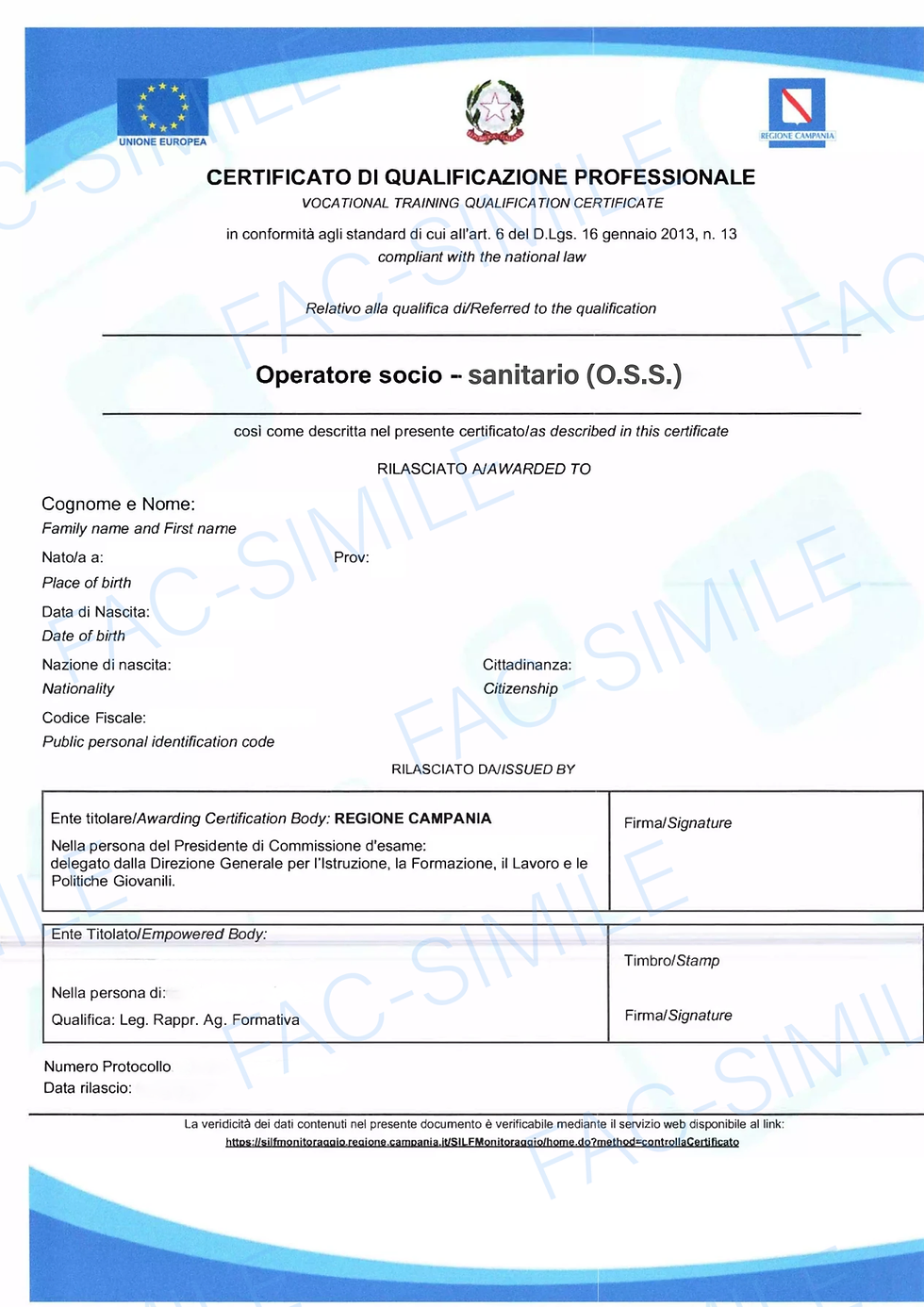 Al termine del corso, previo superamento degli esami finali, verrà rilasciato un Attestato di Qualifica Professionale di Operatore Socio Sanitario con Formazione Complementare (OSSS), riconosciuto a livello nazionale, che consentirà di esercitare funzioni avanzate nel settore sanitario.